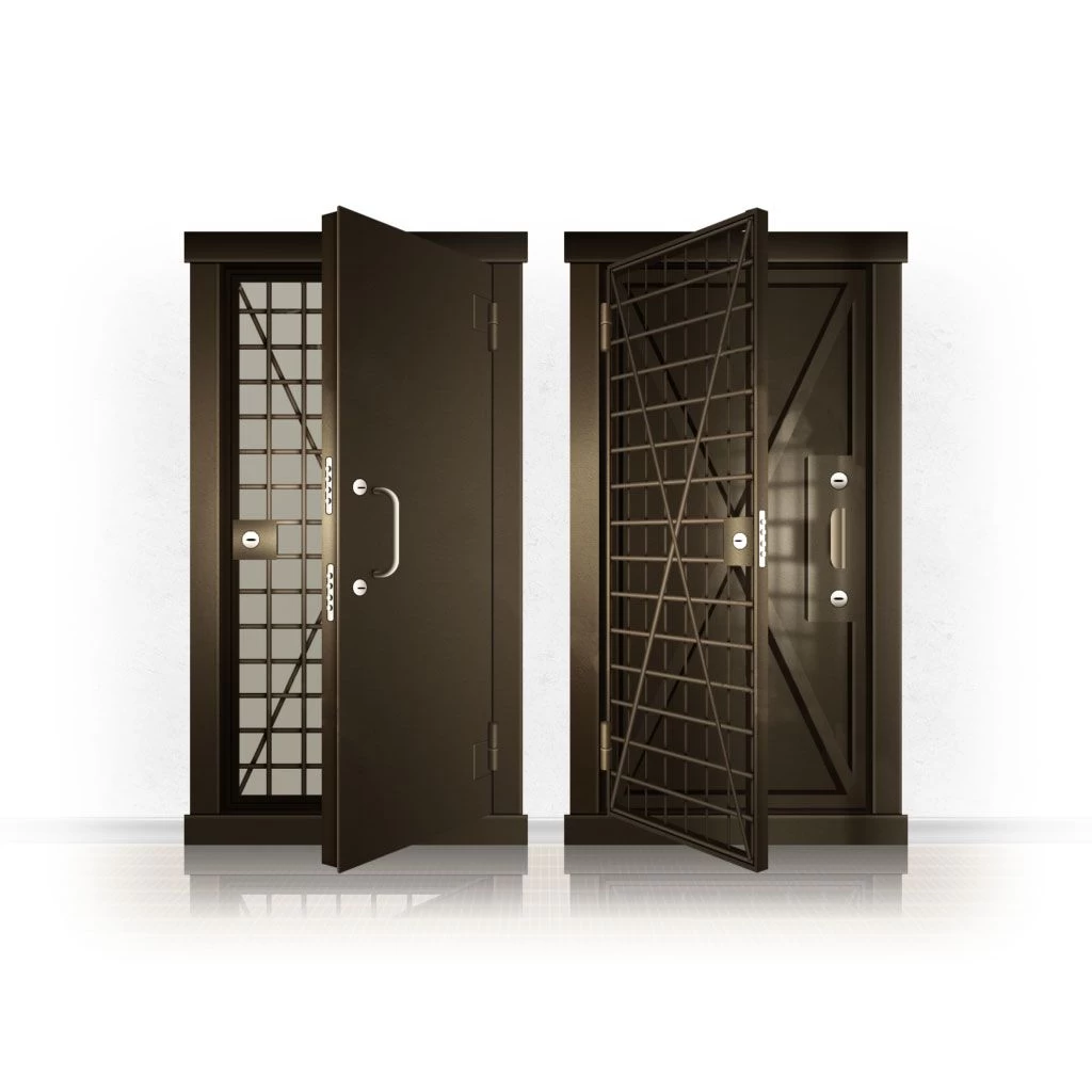 Металлические двери КХО и КХН представляют собой входные блоки, обладающие высоким уровнем взломостойкости и состоят из трех основных элементов: усиленного каркаса, сплошного металлического полотна и решетчатой двери. Дверной блок изготавливается из стального уголка 100*100 мм. Места крепления блока к стене цементируются и закрываются стальными наличниками шириной 40 мм. Крепеж заходит вглубь стены на 80 мм. В конструкции внешней створки монтируются ребра жесткости, для обшивки используется сталь толщиной не менее 3 мм. Внутренняя решетка изготавливается из прутка диаметром 16 мм. Размер ячеек решетки должен составлять не более 15 на 15 см. В точках пересечения прутья надежно приваривают друг к другу. В КХО и КХН необходимо поддерживать определенную температуру и влажность. Для этого внутреннее пространство глухой двери заполняется теплоизоляционным материалом, а по периметру двери приклеивается уплотнитель. Такие двери оборудуются замками с повышенным уровнем взломостойкости. Специализированные двери КХО и КХН в Советском могут быть оснащены сигнализацией, в конструкции могут быть проушины для навесного замка и элементами для опечатывания. Если идет речь о двери в комнату хранения оружия, в створке оборудуется окно для выдачи оружия и спец. средств, которое накрывается стальной дверцей.