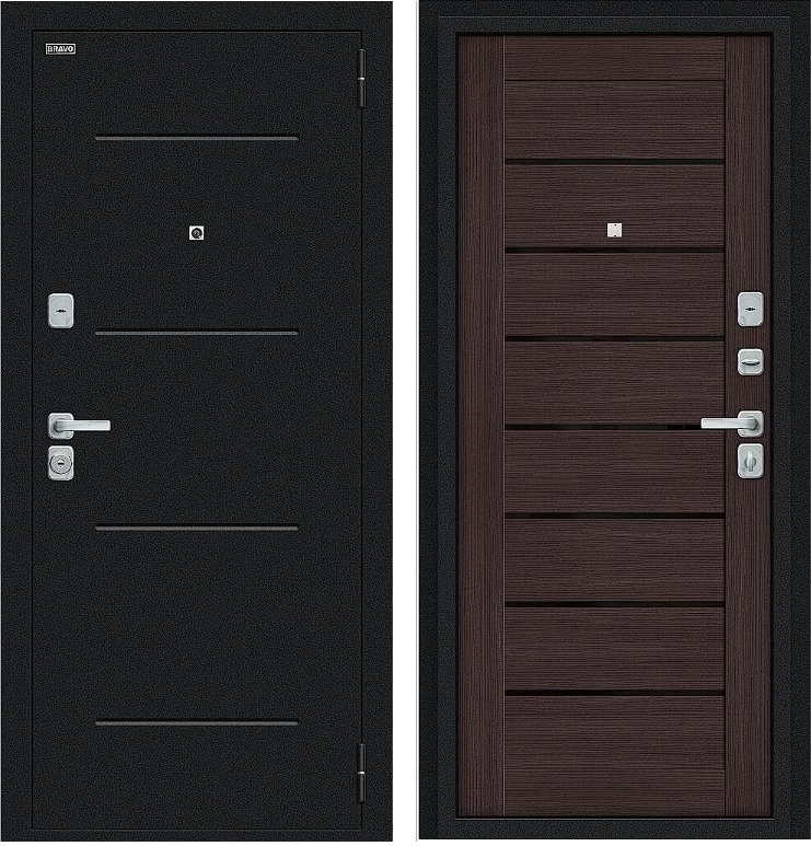 Надежная входная Дверь Браво Техно/BChrome Букле черное/Wenge Melinga премиум класса по цене 35 503 руб. Большая толщина стали защитит от проникновения в ваш дом, квартиру или коттедж. Используется очень качественная фурнитура: замки, цилиндры, ручки, защелки. Покрытие и отделка двери изготовлено под внимательным контролем производителя. Дверь имеет долгий срок службы и гарантию.
